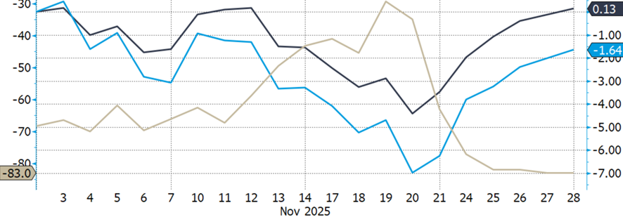 - Sorpresa positiva en el dato de empleo del 20 de noviembre, que redujo aún más las expectativas de recortes de tipos.