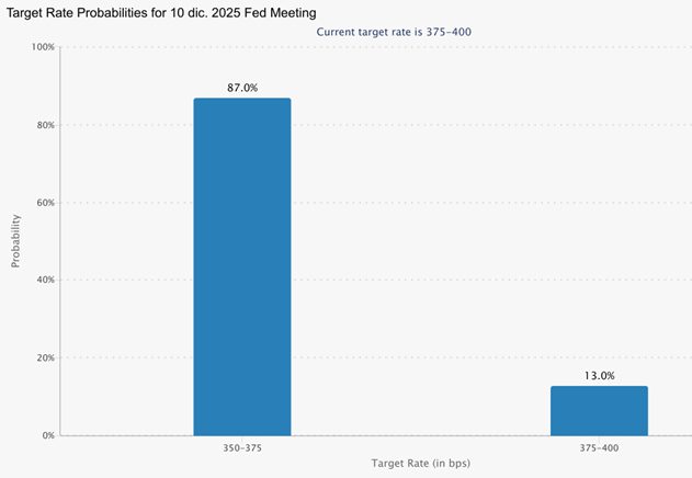 Los mercados siguen extremadamente sensibles a cualquier señal relacionada con la política monetaria. La atención está puesta en la reunión de la Reserva Federal del 10 de diciembre. Según CME FedWatch, la probabilidad actual de una bajada de tipos se sitúa en torno al 87% como se puede ver en esta imagen creada por CME Group[1].